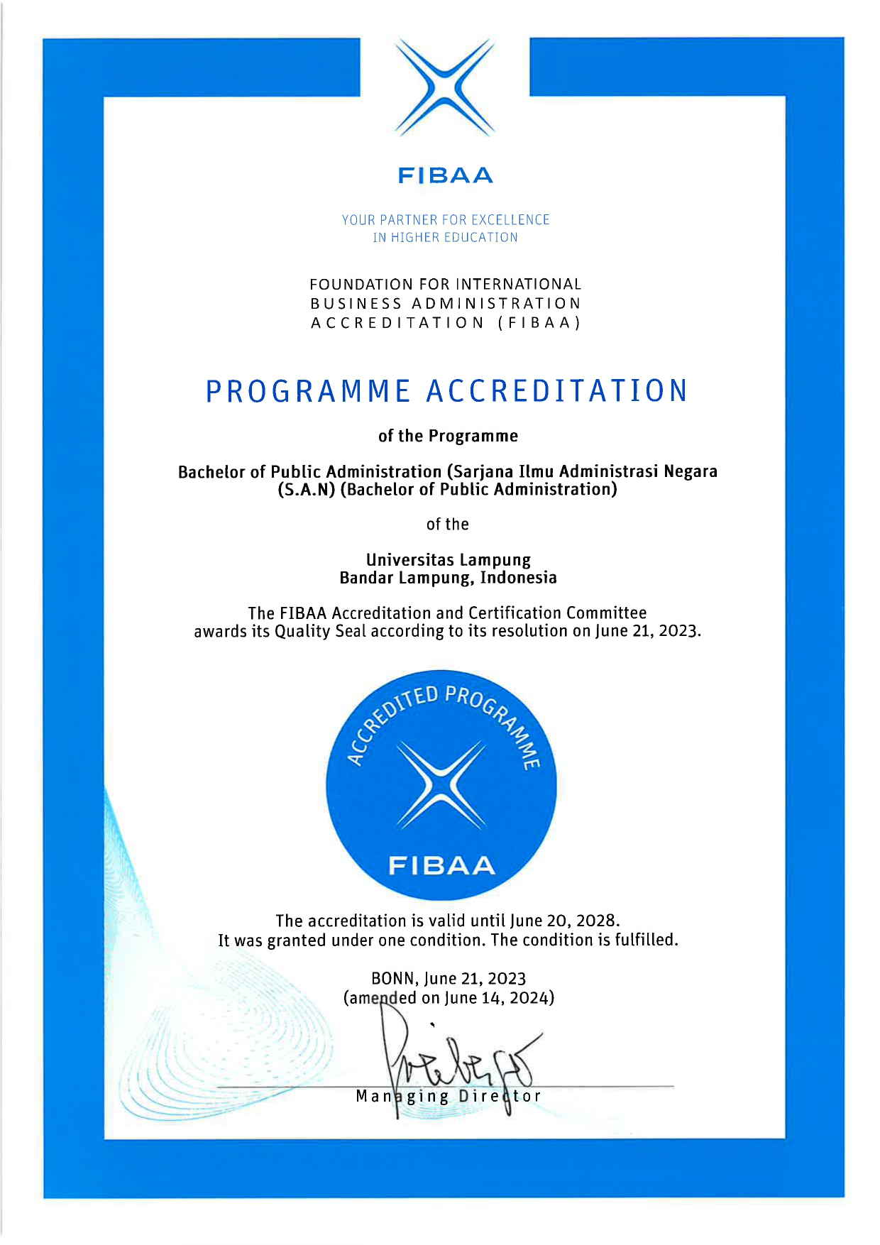 SK BAN PT NNOMOR : 6347/SK/BAN-PT/Ak.KP/S/V/2025, menyatakan bahwa PS S-1 Administrasi Negara FISIP Unila terakreditasi Unggul